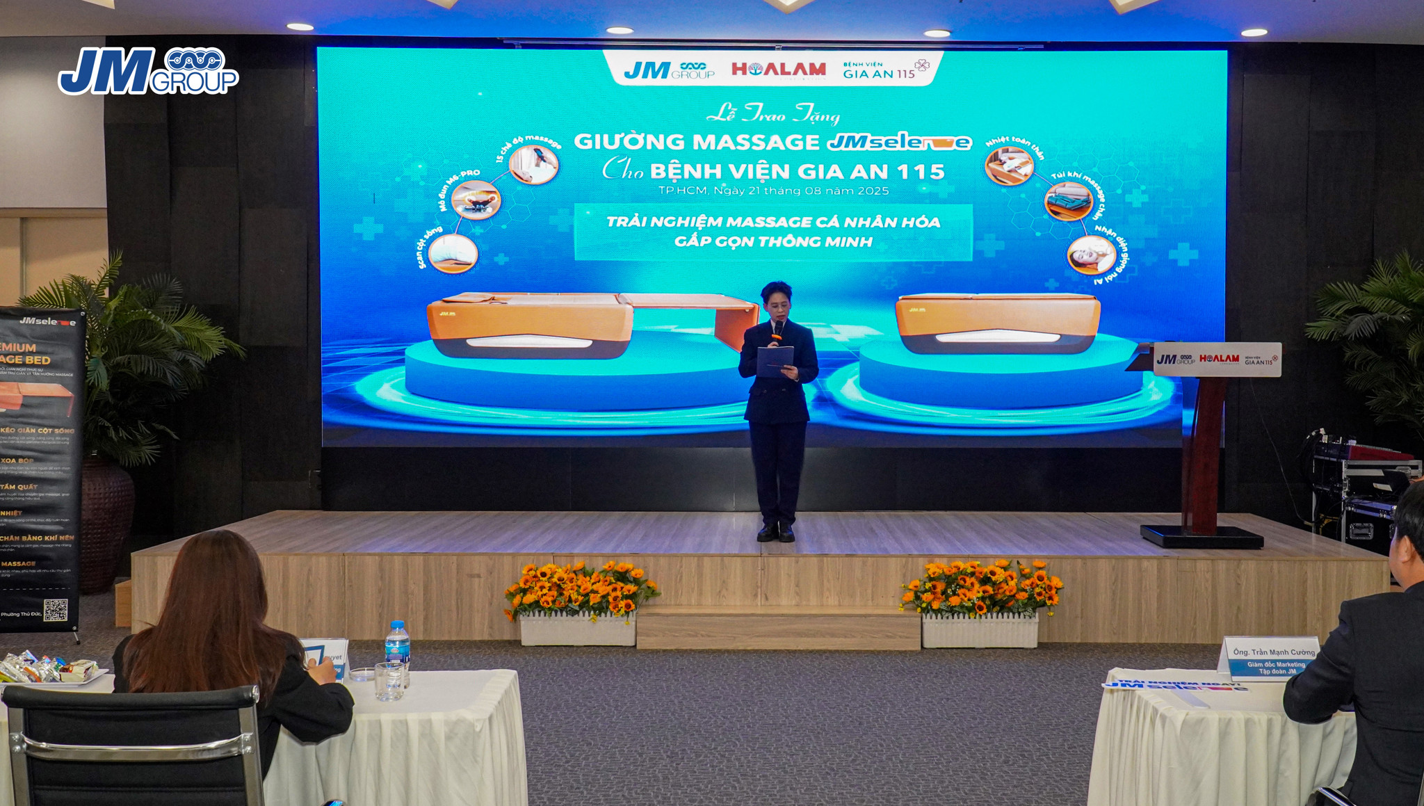 Đại diện Bệnh viện Gia An 115, bà Nguyễn Thị Thanh Nguyệt phát biểu: “Chúng tôi rất trân trọng món quà thiết thực và đầy ý nghĩa này từ Tập Đoàn JM Group. Giường massage JM Selene sẽ là sự bổ sung quan trọng cho Khoa Vật lý trị liệu, giúp đội ngũ y bác sĩ có thêm thiết bị hiện đại, hỗ trợ bệnh nhân trong quá trình điều trị và phục hồi. Đây không chỉ là sản phẩm chăm sóc sức khỏe, mà còn là minh chứng cho tinh thần đồng hành cùng cộng đồng của 2 công ty.”