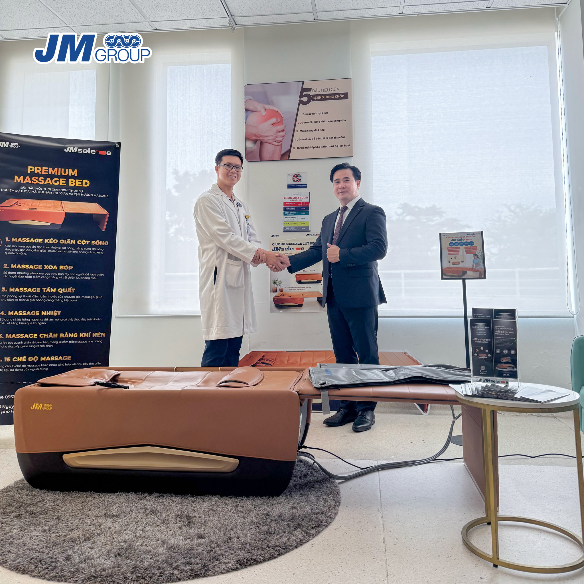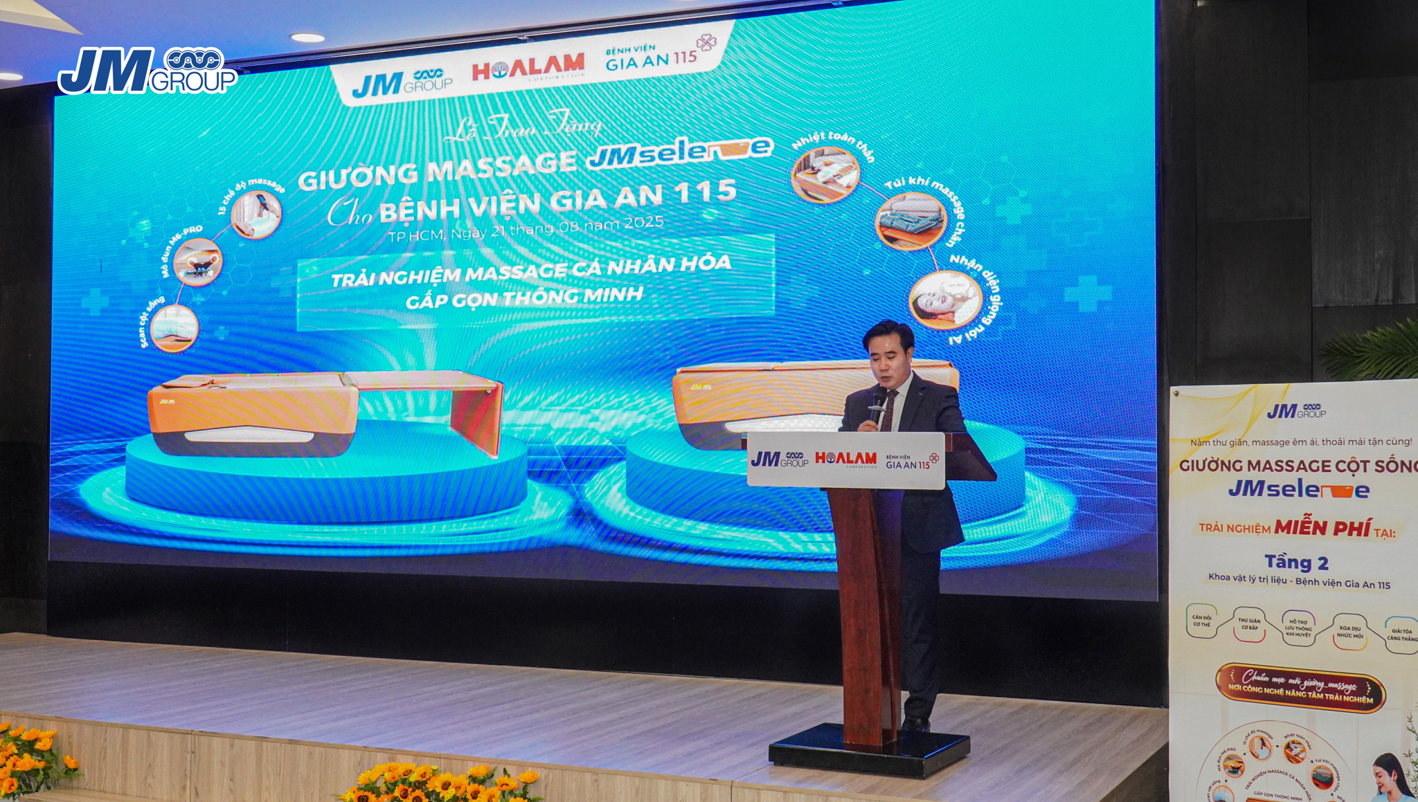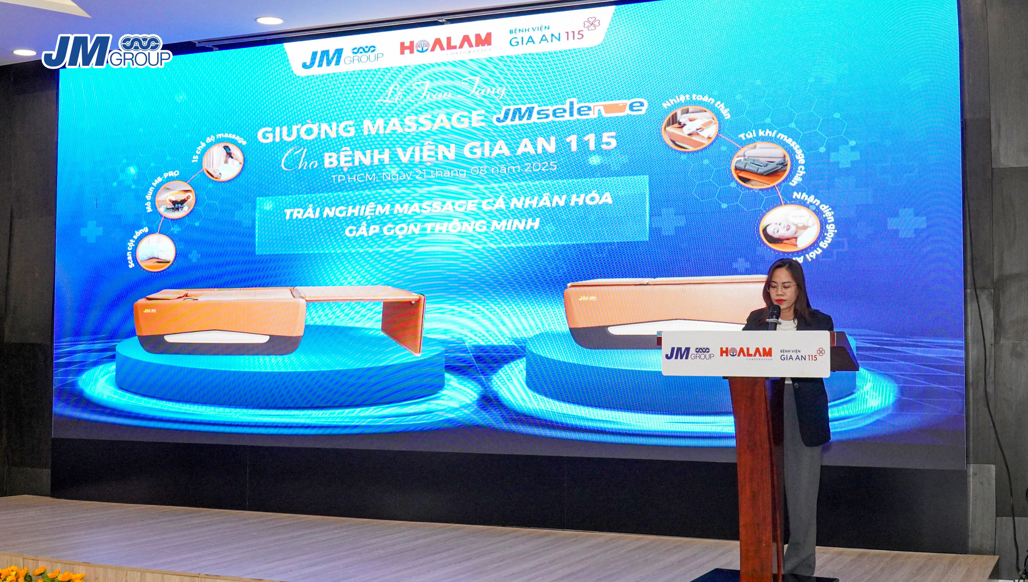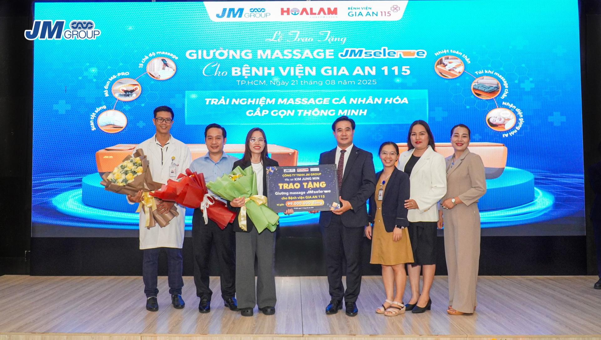 Với mong muốn nâng cao chất lượng chăm sóc sức khỏe, JM Group đã bàn giao giường massage JM Selene – sản phẩm ứng dụng công nghệ Hàn Quốc đầu tiên tại Việt Nam – đến Khoa Vật lý trị liệu và Phục hồi chức năng của Bệnh viện Gia An 115. Thiết bị hiện đại này không chỉ hỗ trợ bệnh nhân trong quá trình điều trị mà còn giúp đội ngũ y bác sĩ có thêm thiết bị để nâng cao hiệu quả phục hồi, góp phần cải thiện chất lượng dịch vụ y tế dành cho cộng đồng.